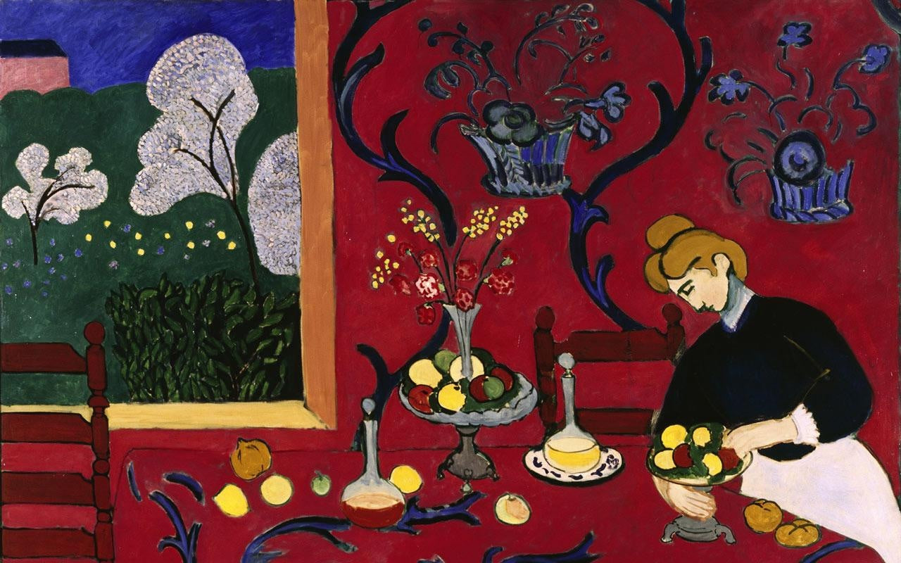 Painted in 1908, Harmony in Red is a striking example of Matisse’s radical use of color and flattened space. The entire scene is dominated by a rich, vibrant red, dissolving the boundaries between table, wall, and background pattern. A woman arranges fruit and wine on the table, surrounded by decorative elements that feel more like rhythm than realism. Originally commissioned as Harmony in Blue, Matisse famously repainted it in red, believing it better expressed the emotion and energy he sought. The result is a bold, immersive work that blends everyday life with dreamlike abstraction.